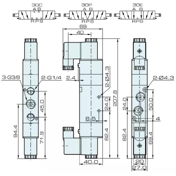 | Valve Type | 30C | 10:Single solenoid 5/2 way 20:Double solenoid 5/2 way 30C:Double solenoid 5/3 way closed center 30E:Double solenoid 5/3 way exhaust center 30P:Double solenoid 5/3 way pressure center |